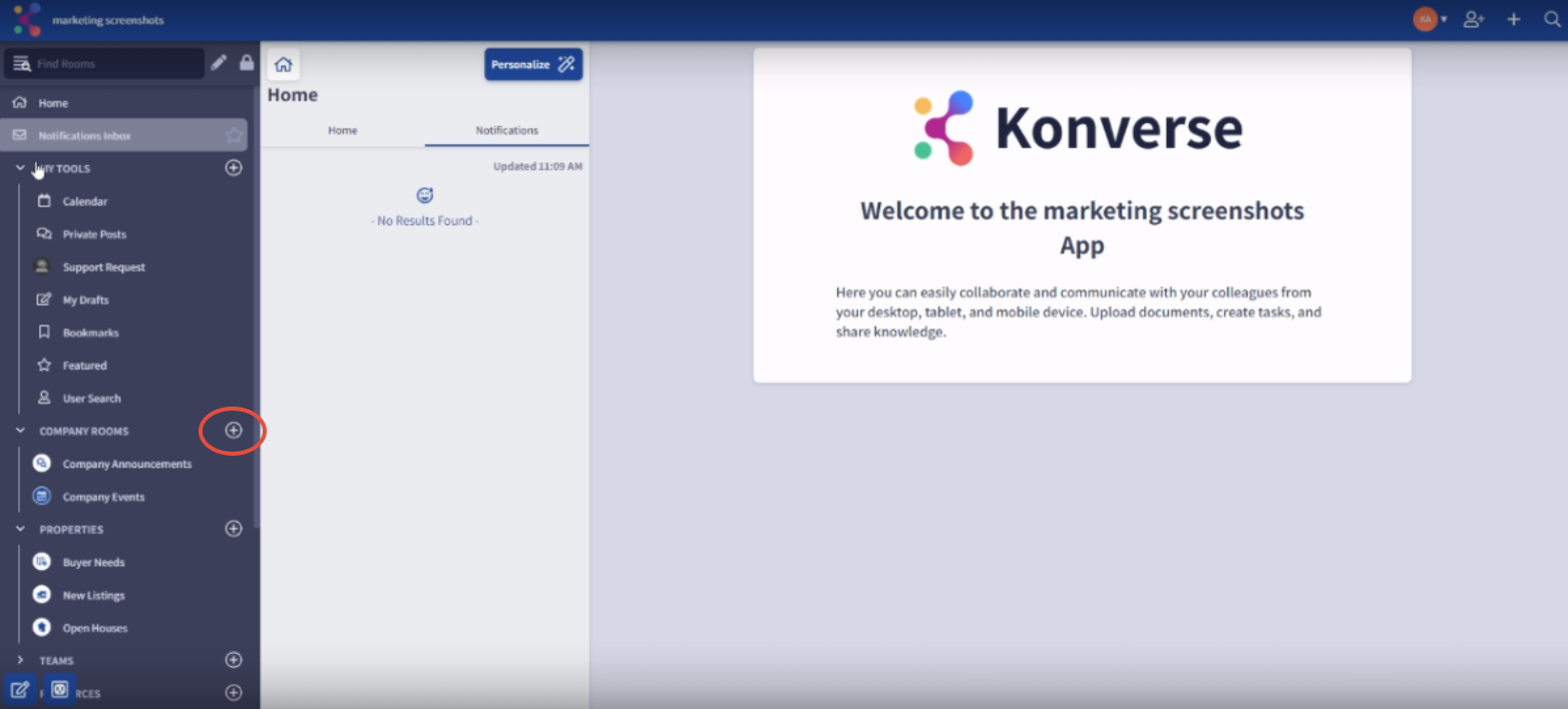 The room categories are listed in the left side navigation menu. In the screenshot below, the categories include MY TOOLS, COMPANY ROOMS, PROPERTIES, etc.