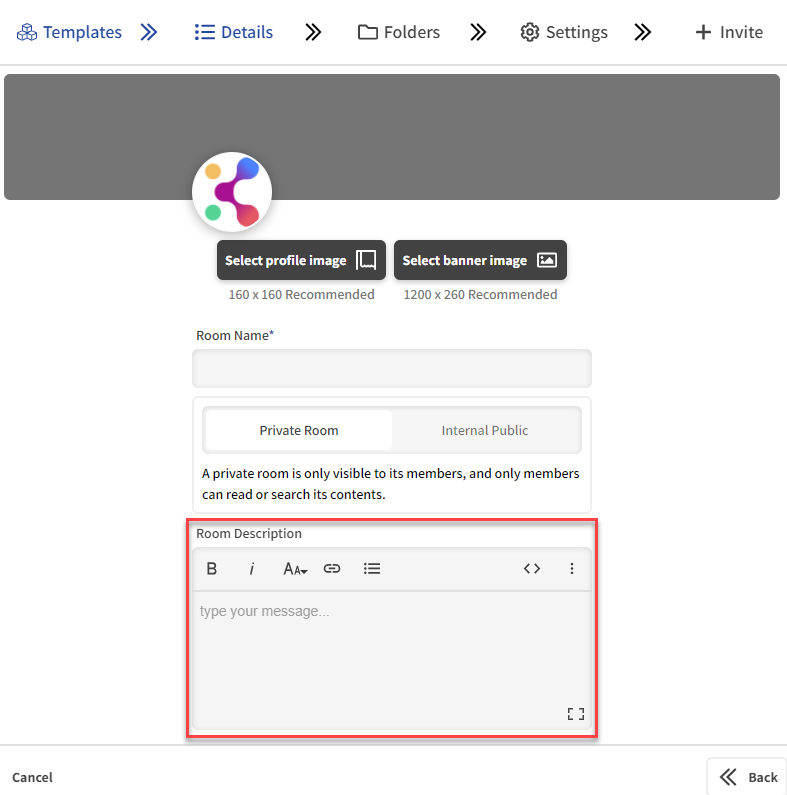 Type a short description of the room in the Description box. Once the room is created, the description is visible on the main panel when the room is selected in the navigation bar. When done, click continue.