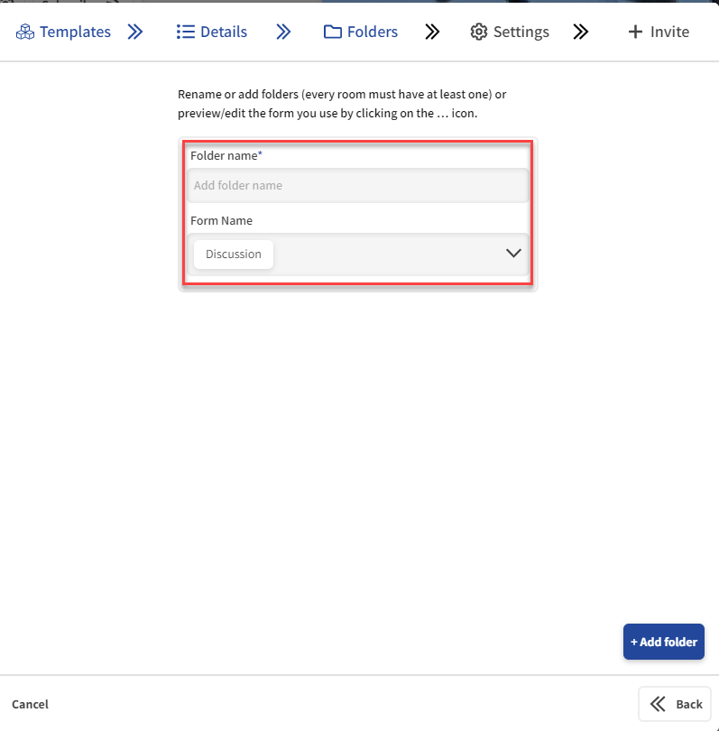 To add another folder to the room, click the Add folder button and then give the room a name and select a form type in the same manner as above.