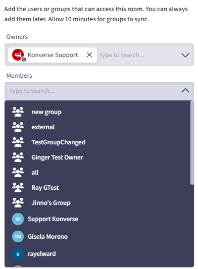 When assigning Owners and Members to a room, you can select individual users or groups. Adding groups will add all the group members and update the room Owners/Members automatically whenever the group is updated.