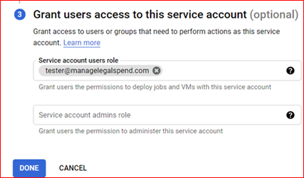 Under Grant Users Access to this Service Account add the user you created in step one in the Service account users role field and click Done