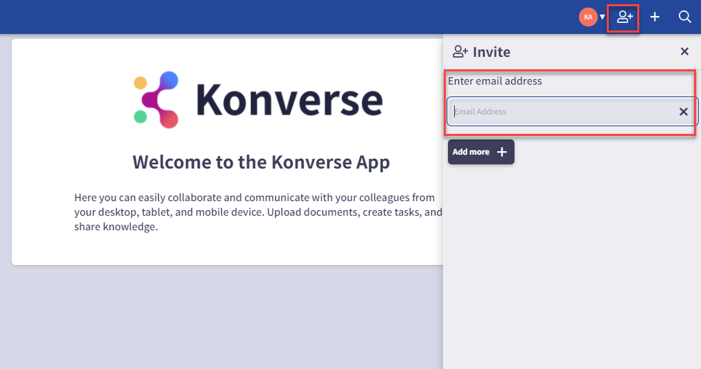 - Fill in the user email address. If you want to invite multiple users at once, click on the 'Add more +' button to add in additional users.