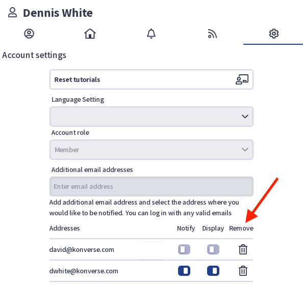 If a user has more than one email address on their profile, they can remove one by clicking on the trash can icon under the word "remove".