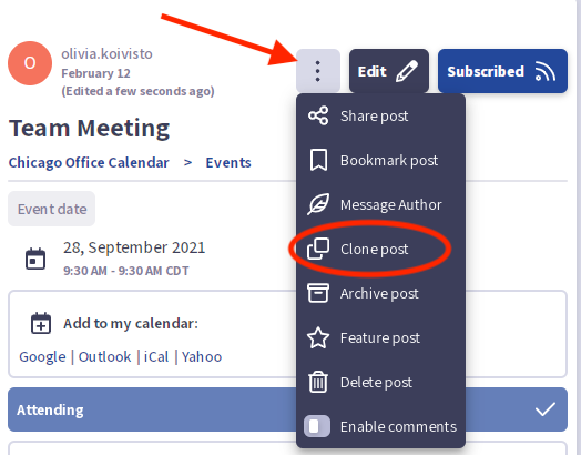 Next, click on "clone post" and a copy of the post will appear for editing. Please note that the word "clone" has been added to the subject line, and you may wish to remove this.