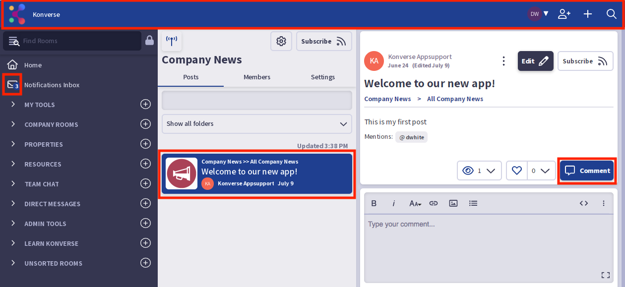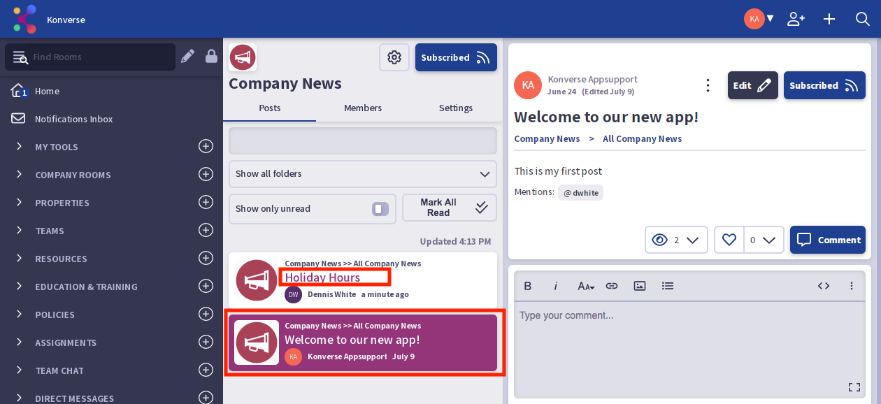 - 600 - Left navigation background color, folder dropdown background, edit & view post buttons until selected, font color for: post view title, field headers, views, likes, tool bar in comments, subscribe button & attachment section, post list font color for room name, posts, members, settings, folder