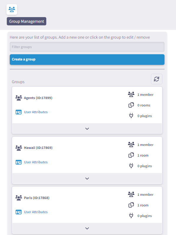 Once your User Attribute Group is created, you are able to manage the settings of that User Attribute Group from within the same Member Management > Group Management tab. To begin, locate your User Attribute Group by scrolling through the list of available groups or by searching for it in the "Filter Groups/Search bar" tool. After locating your User Attribute, select the dropdown arrow to expand the list of management options.
